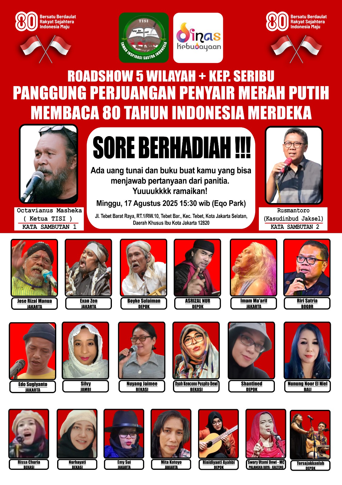 JAKARTA | POROSNUSANTARA.COM – Road show lima wilayah di DKI Jakarta dan Kepulauan Seribu, panggung perjuangan merah putih membaca 80 tahun Indonesia merdeka akan menghadirkan sekitar 20 penyair berturut-turut mulai tanggal 17,18,22,23,24, dan 30 Agustus 2025.