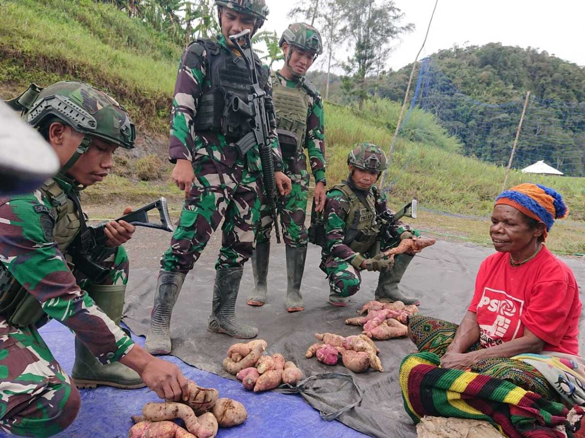 PAPUA | POROSNUSANTARA.COM – Prajurit Satgas Mobile Yonif 323 Buaya Putih membantu membeli hasil Tani masyarakat yang dijual mama-mama Papua didepan TK Pintu Jawa, Kab.Puncak, Papua, Rabu (19/06/24)
