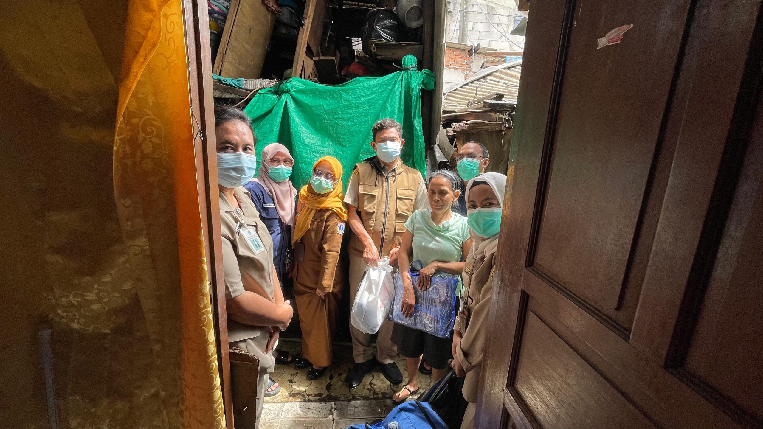 Tim pusdatin yang membawakan bantuan dari lurah Papanggo, (DRS. Sugiharjo Timbo, M. Si.) didampingi staff kasi kesra , Soleh dan kepala Puskesmas Kel. Papanggo, dr.Artika Tambunan berserta jajaran
