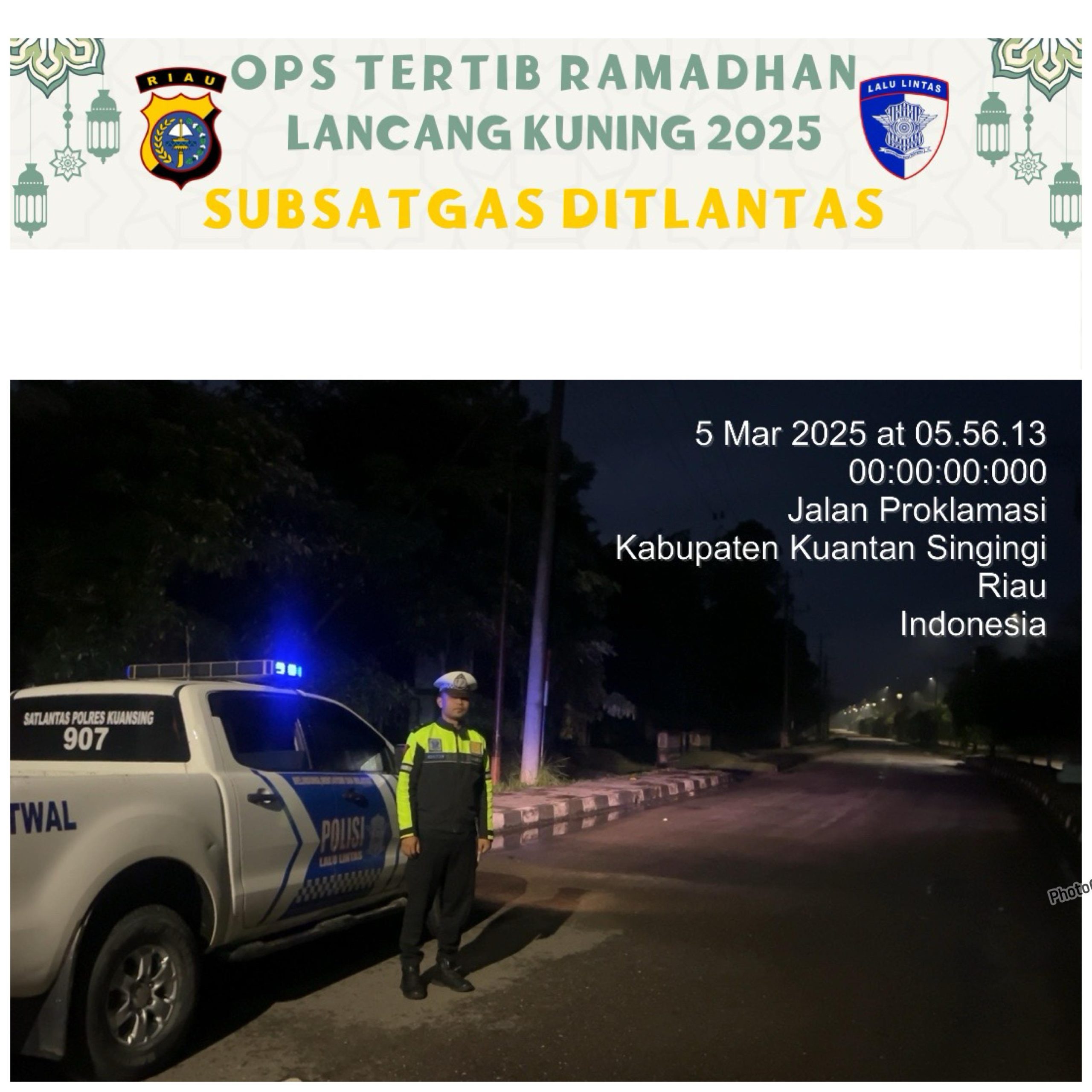 Kapolres Kuantan Singingi AKBP Angga F. Herlambang, S.I.K., S.H., melalui Kasat Lantas Polres Kuansing, AKP A. Ramadhan, S.H., M.Si., menyampaikan “Patroli ini merupakan bagian dari Operasi Tertib Ramadhan Lancang Kuning 2025, yang bertujuan untuk menjaga ketertiban masyarakat, khususnya pada waktu subuh, ketika banyak remaja dan pemuda berkumpul di tempat-tempat tertentu setelah melaksanakan sahur dan sholat subuh,” ujar Kasat.
