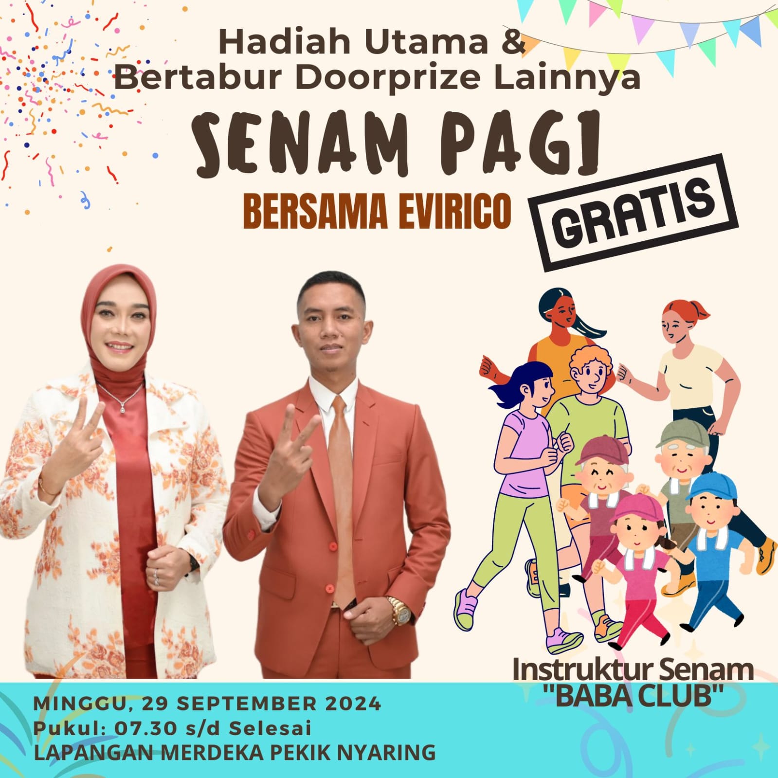 BENGKULU TENGAH | POROSNUSANTARA.COM – Dalam rangka memperkuat sosialisasi ke masyarakat serta menanamkan rasa cinta hidup sehat, Pasangan Calon Bupati dan wakil Bupati Bengkulu Tengah Nomor urut 2 Evi Susanti dan Rico Zaryan mengadakan kegiatan senam sehat gratis, lokasi kegiatan di pusatkan di lapangan merdeka Desa pekik nyaring Kecamatan Pondok Kelapa,kegiatan ini bertabur Hadiah, ada hadiah utama dan doorprize menarik yang akan di berikan ke masyarakat yang hadir mengikuti kegiatan senam sehat tersebut.