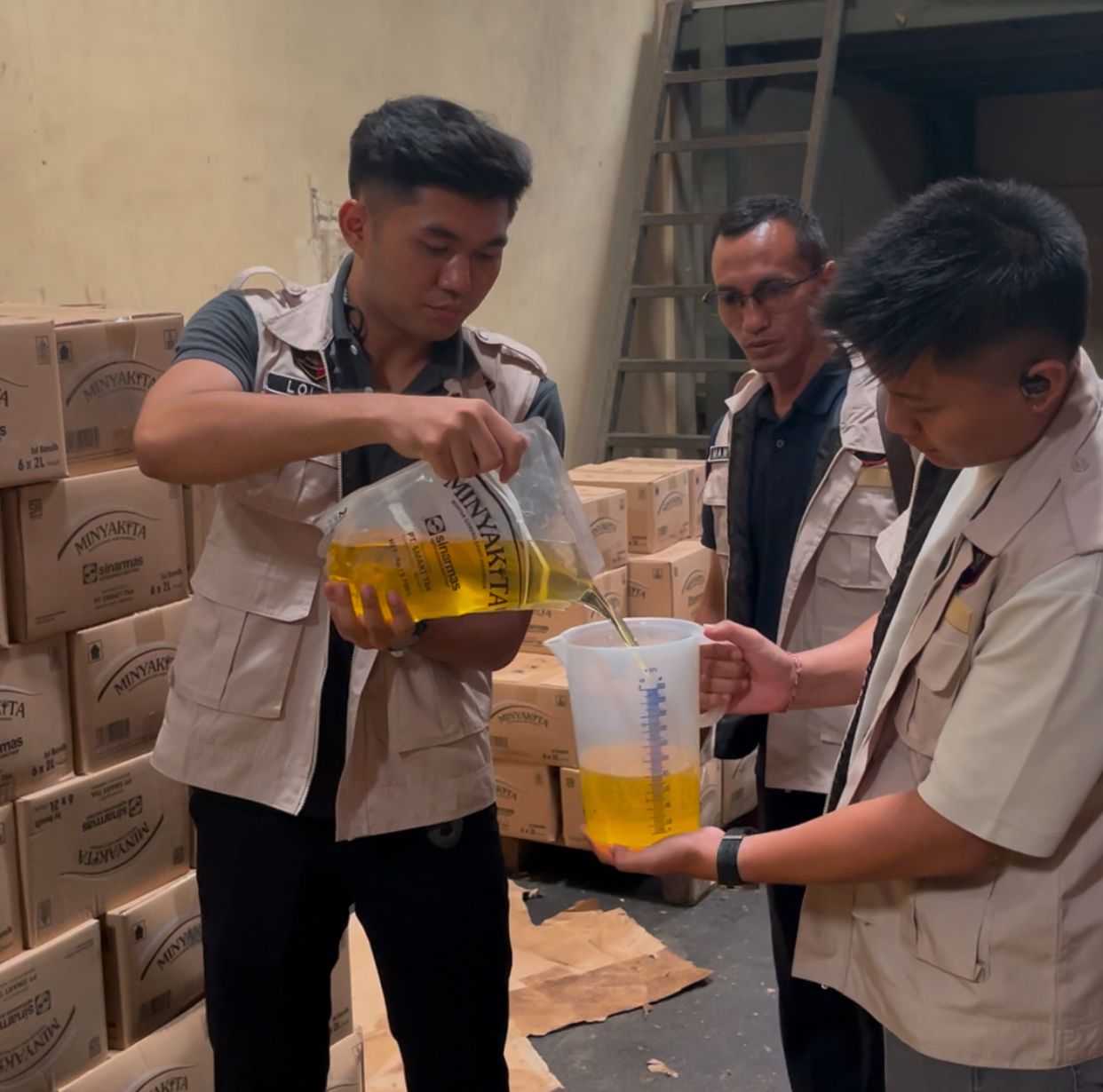 Dibawah komando AKBP Wiliam Sitorus S.I.K., Kasubdit I Ditreskrimsus Polda Bali, para personil mengecek takaran dan harga jual tertinggi (HET) Minyakita yang diambil secara acak sebagai sempel pengecekan ukur takaran menggunakan gelas takar.