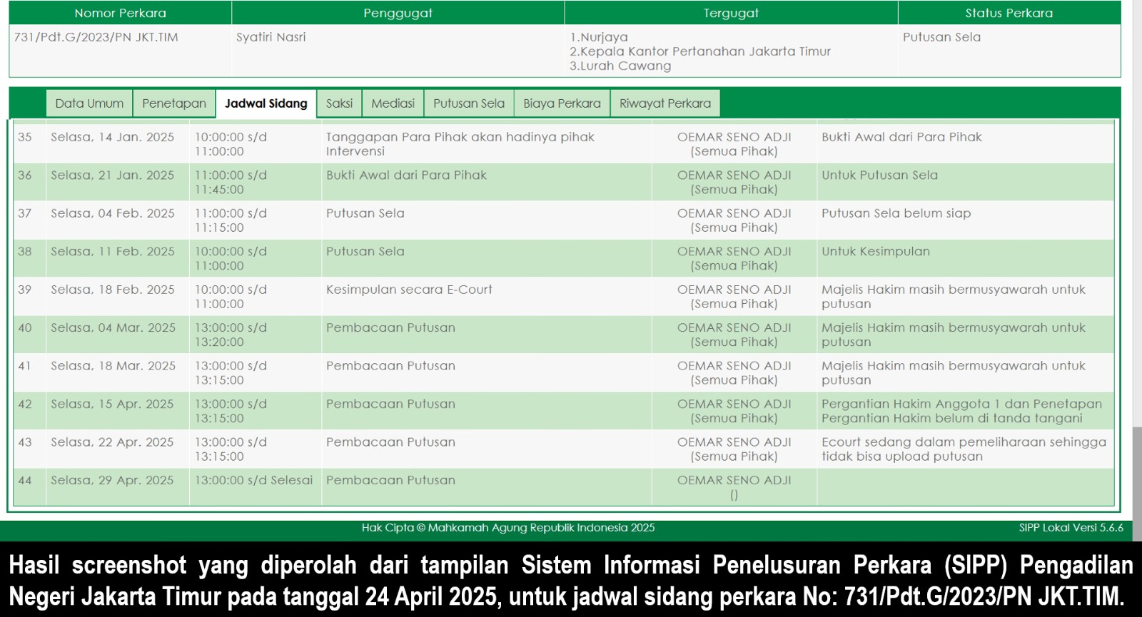 Hakim masih bermusyawarah untuk putusan, kemudian penundaan kedua tanggal 18 Maret 2025 dengan alasan yang sama yaitu Majelis Hakim masih bermusyawarah untuk putusan, selanjutnya penundaan ketiga tanggal 15 April 2025, dimana penundaan tersebut dengan alasan karena ada pergantian hakim anggota yang ternyata penetapannya belum di tandatangani oleh Ketua PN Jakarta Timur, selanjutnya penundaan keempat kalinya tanggal 22 April 2025 dengan alasan Ecourt sedang dalam pemeliharaan sehingga tidak bisa upload putusan, oleh karena itu jadwal putusan akan dilakukan pada tanggal 29 April 2025 pekan depan.