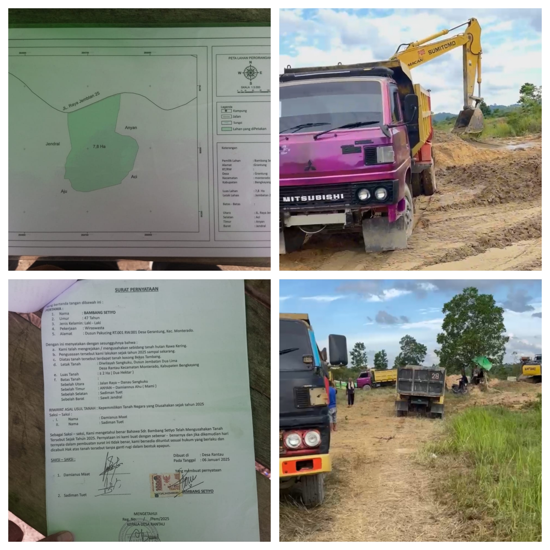 Tim investigasi menemukan kejanggalan mencolok dalam dokumen kepemilikan tanah yang ditunjukkan Bambang. Surat Keterangan Tanah (SKT) yang ia pegang memuat nama dan tahun penerbitan yang berbeda-beda—mengindikasikan dugaan kuat pemalsuan dokumen dan praktik mafia tanah. Selain itu, keterangan warga menyatakan bahwa lokasi tambang sebenarnya berada di wilayah Kota Singkawang, bukan Kabupaten Bengkayang, seperti yang diklaim oleh Bambang.