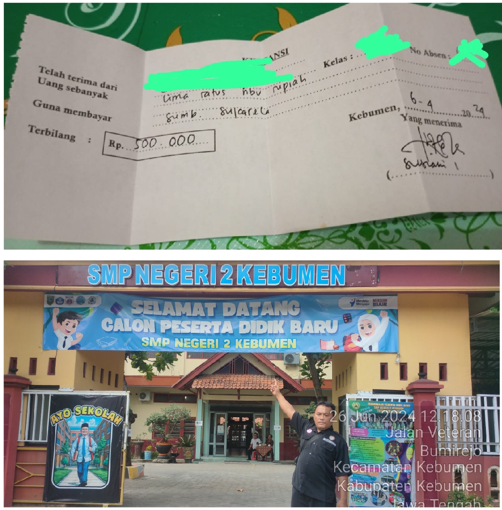 ” Bahkan disekolah kami ada yang sama sekali nggak bayar sumbangan kok mas, kami tidak maksa, ya jangan cuma sumbangan yang nominalnya 1 juta keatas saja yang dilihat mas, yang kecil kecil 500.000 Ribu kebawah juga di lihat juga mas, kalau yang bertanda tangan di atas kwitansi pembayaran sumbangan itu benar dia TU di sekolah kami, orangnya tidak masuk hari ini” kata Siti (28/6/2024).