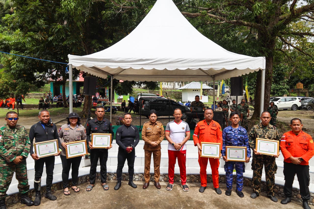 Suwandi, S.A.P., M.M., M.T., diwakili oleh Wakil Komandan Lantamal IX (Wadan Lantamal IX) Kolonel Laut (P) Batos Leksono mengikuti Upacara Pengibaran Bendera Bawah Laut Tahun 2025, bertempat di Pantai Batu Kuda, Desa Tulehu, Selasa (12/08/2025).