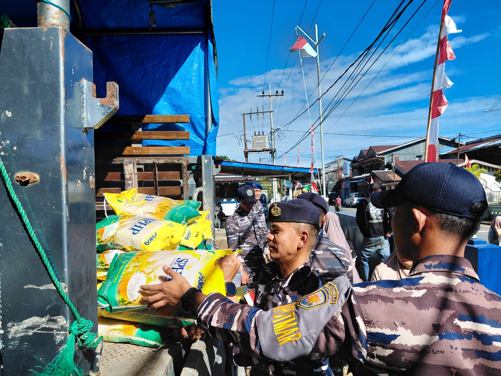 POROSNUSANTAR.COM TNI AL, Simeulue,- Berlokasi di depan Kantor Primkopal Lanal Simeulue, Komandan Pangkalan TNI Angkatan Laut Letkol Laut (P) Wisnu Pryangga N, S.T., M.Tr. Opsla., beserta Prajurit Lanal Simeulue melaksanakan kegiatan penyaluran beras Stabilisasi Pasokan dan Harga Pangan (SPHP) melalui program Gerakan Pangan Murah (GPM) yang dilaksanakan atas kerjasama dengan Perum Bulog di Kabupaten Simeulue, Provinsi Aceh, Selasa (2/9/2025).