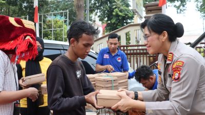 Polwan Polres Metro Jakarta Selatan Bagikan 400 Paket Makanan Siap Saji untuk Jemaah Sholat Jumat