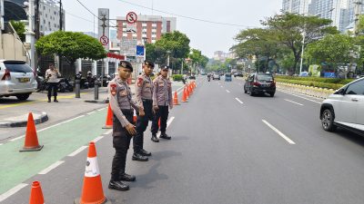 Unit Patroli Polsek Johar Baru bersama Personil Polres Metro Jakarta Pusat Melakukan Pengamanan sekaligus Pengaturan Arus Lalu Lintas Jalan Salemba Tengah Kecamatan Senen