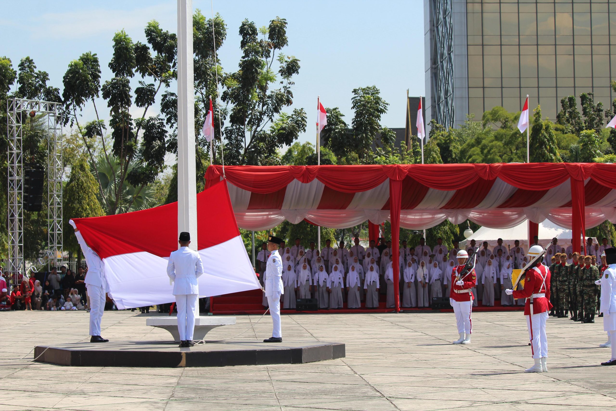 Momen bersejarah sungguh terasa Ketika pasukan Paskibraka berhasil mengibarkan Sang Merah Putih dengan sempurna, suasana upacara dipenuhi dengan rasa bangga dan haru. Bendera Merah Putih berkibar gagah di udara, menjadi simbol kebanggaan dan semangat kemerdekaan yang tak pernah pudar.