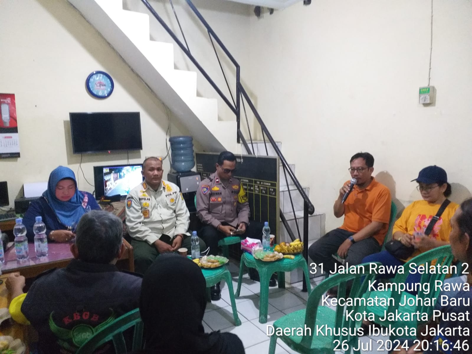 JAKARTA | POROSNUSANTARA.COM – Bhabinkamtibmas Kelurahan Kampung Rawa Aipda Ikhwan Mulyadi, S.H., bersama Tiga Pilar, menghadiri pertemuan rutin pengurus RT dan RW wilayah Kampung Rawa di Pos Sekretariat RW 05 Kampung Rawa, jalan Rawa Selatan II RW 05 Kelurahan Kampung Rawa, Kecamatan Johar Baru Jakarta Pusat. Jum’at (26/7/2024)