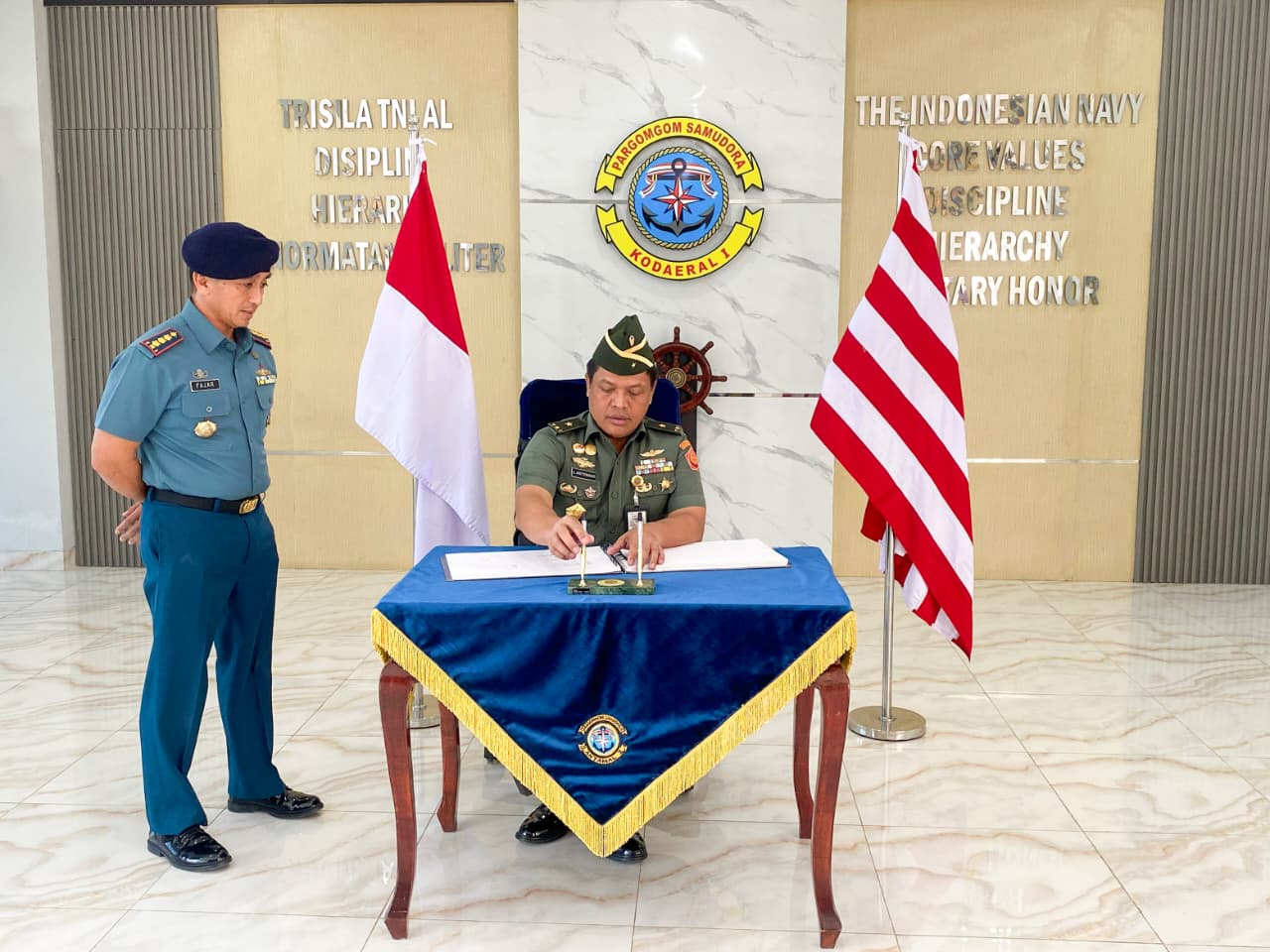POROSNUSANTARA.COM | TNI AL, Belawan,- Komandan Kodaeral I Laksamana Muda TNI Deny Septiana, S.I.P., M.A.P. diwakili Wadan Kodaeral I Kolonel Laut (P) Fajar Tri Rohadi, S.E., menerima kunjungan kerja Tim Satgas Penatausahaan Pemanfaatan Barang Milik Negara di Lingkungan Kemhan dan TNI yang dipimpin oleh Brigadir Jenderal TNI Jhoni Aritonang., S.E,. M.Han,. FRMP., beserta rombongan, bertempat di Ruang VIP Makodaeral I, Rabu (27/8/2025).