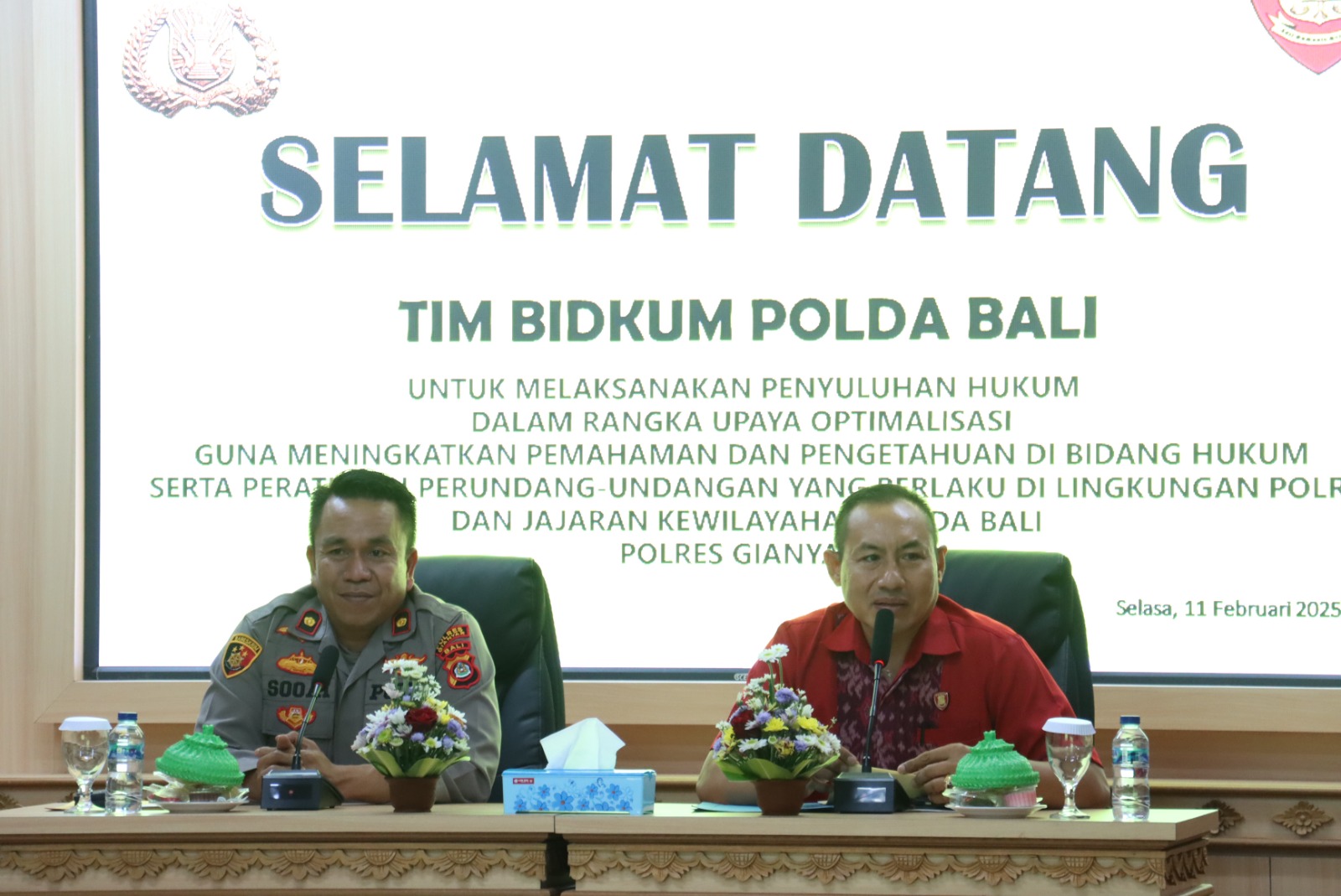 Gianyar. Bidang Hukum (Bidkum) Polda Bali memberikan penyuluhan hukum kepada personil Polres Gianyar dan Polsek jajaran bertempat di Rupatama Catur Prasetya Polres Gianyar. Selasa (11/2/2025). Kegiatan dipimpin langsung oleh Kaurluhkum Subbid Sunluhkum Bidkum Polda Bali Kompol I Nyoman Gatra, S.H.,M.H.