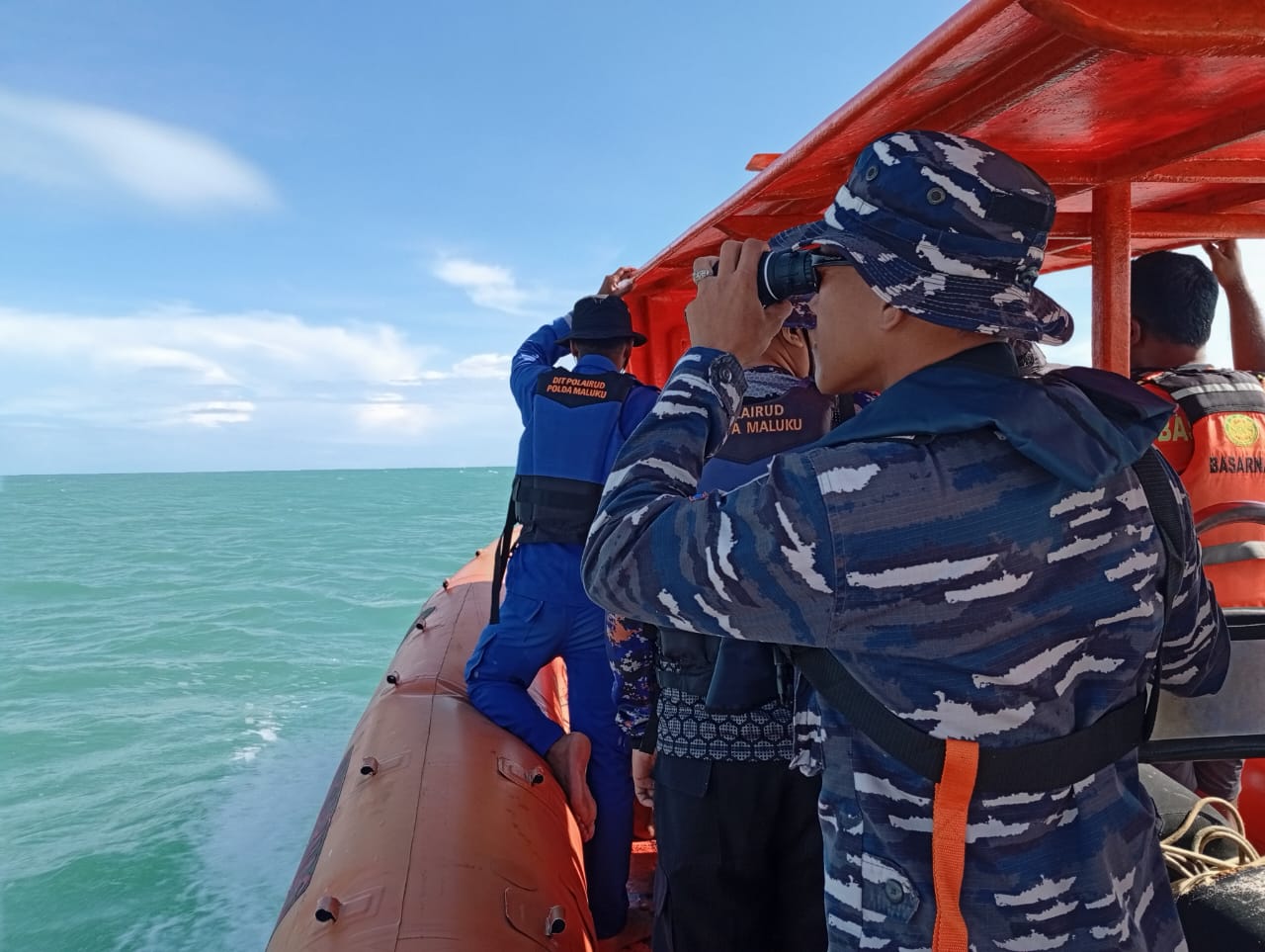 sama Tim SAR Gabungan diantaranya Basarnas, Polairud, dan masyarakat nelayan setempat terus melakukan pencarian nelayan yang hilang di Perairan Seram Bagian Timur, Jumat (15/08/2025).