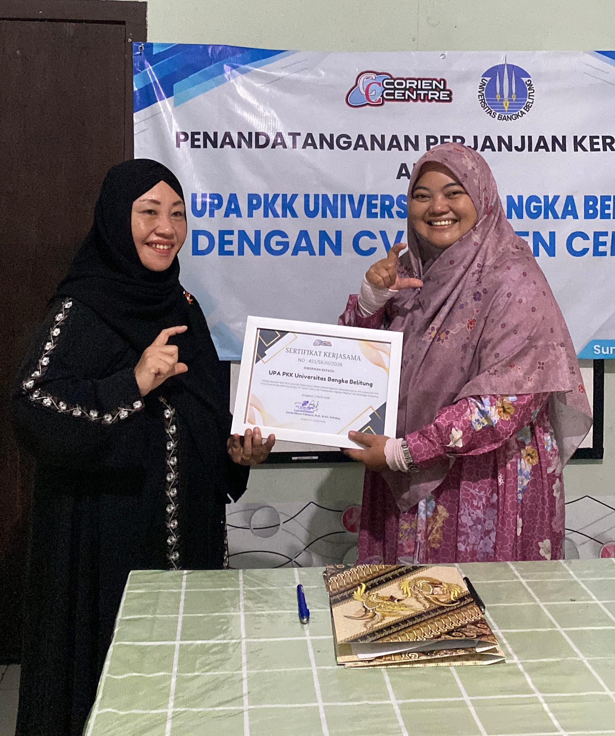 BANGKA BELITUNG | POROSNUSANTARA.COM – Bertempat di kantor Corien Centre Jalan Singa Yudha No.19, Parit Padang, Sungai Liat, Kabupaten Bangka, Kepulauan Bangka Belitung, Selasa 3 Maret 2026 dilakukan penandatanganan MoU dengan Unit Penunjang Akademik Pengembangan Karir dan Kewirausahaan (UPK PKK) Universitas Bangka Belitung dalam rangka pengembangan Karir Mahasiswa dan kewirausahaan.