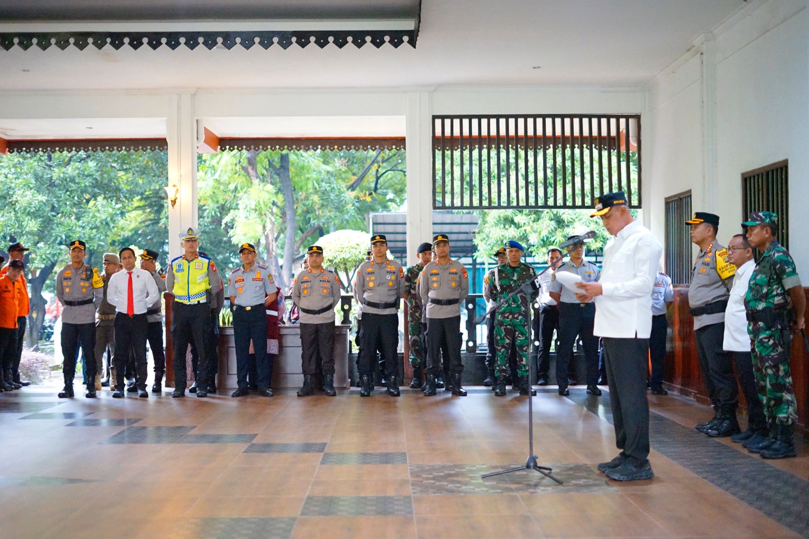 Apel gabungan dipimpin langsung oleh Wali Kota Bekasi Dr. Tri Adhianto, didampingi Kapolres Metro Bekasi Kota Kombes Pol. Kusumo Wahyu Bintoro serta Komandan Kodim 0507/Bekasi Kolonel Arm Krisrantau Hermawan.